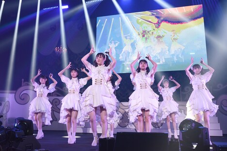 オープニングではこの公演のために作られたというにぎやかな「overture」が流れ、華やかな管楽器の音色に客席の期待が高まってゆく。そしてステージ前方の幕が上がると、そこにはきらびやかなステージセットに立ち並んだメンバーの姿が。登場から会場の皆産(いぎなり東北産ファンの呼称)を驚かせた9人は笑顔でライブをスタートさせ、2曲目の「うぢらとおめだづ」では弾けるようなパフォーマンスを展開。曲中に北美梨寧と安杜羽加が手にした銃でスモークを噴射してステージを盛り上げると、オーディエンスは手にしたペンライトをより一層大きく振った。また「乾杯ニッポン」では、途中で袖に駆けていった藤谷美海が金色に輝くワイングラスを片手にステージに戻り、皆産に向かって乾杯。彼女を先頭にして客席にウェーブを作るなど、会場中が一体となって盛り上がった。