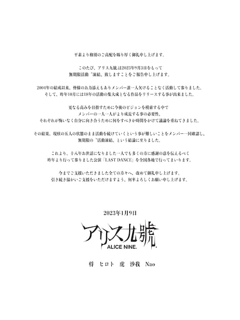 アリス九號.は昨年11月に結成18年の活動の集大成となるアルバム「GRACE」をリリース。さらなる高みを目指すために今後のビジョンを模索する中で、メンバー1人ひとりがより成長することの必要性、そしてそれぞれが悔いなく自分に向き合うために何をすべきかを時間をかけて議論を重ねてきた結果、現状の5人の状態のまま活動を続けていくのは難しいことをメンバー一同確認し、無期限の活動凍結という結論に至った。