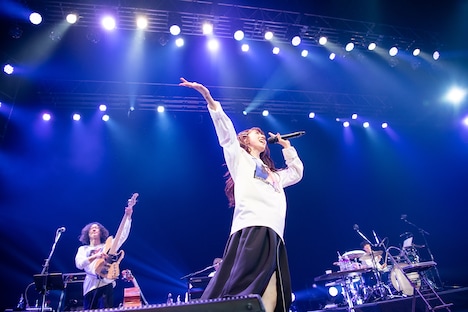 「ズシンと来る曲を選びました」という次のブロックでは、Indigo la Endの「邦画」、そして「ちゅうおん」に続いての披露となった「シンデレラボーイ」、さらに清竜人の「痛いよ」を歌った真山。ときに儚げに、ときにエモーショナルに歌声を響かせ、豊かな表現力でフロアを圧倒する。バンドセッションの間にジャケットを脱ぎ、ノースリーブ姿になった真山がマカロニえんぴつの「星が泳ぐ」をさわやかに歌うと会場の空気は一変。ミラーボールがきらめく中で「宇宙は砂時計」を披露したあと、真山は「(ステージ袖で)スタッフさんから『ええ感じで重い女だったよ』と言われました」と明かし、茶目っ気たっぷりに笑った。