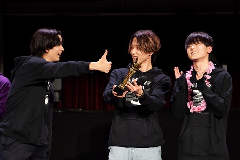 続いてコントコーナーへ。コントは4つに分かれたシャッフルユニットで行われることになっており、トップバッターは最年長の春斗(CUBERS)率いるアロマポワーズ。まるでお母さんのような店主・阿部隼大(THE SUPER FRUIT)が切り盛りする店に訪れた学生・松本勇輝(THE SUPER FRUIT)は、世話焼きの“阿部お母さん”の温かい人情に触れる。そこに“お兄さん”のような常連・春斗と、“お姉さん”のような常連・笠松正斗(世が世なら!!!)が加わり、4人は他人であるはずなのにまるで家族のように喧嘩し、絆を深めていく。上京して家族と離れ離れになっていた松本は、次第に心を開いていき……という心温まる内容のコントでオーディエンスの喝采をさらった。