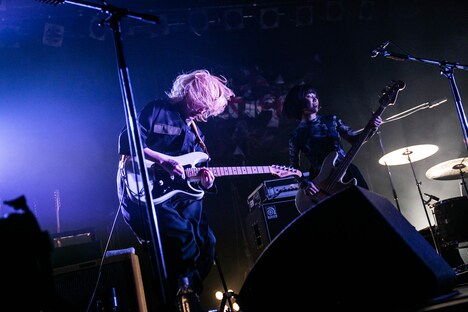 アンコールで再びステージに姿を現した4人は、「POOL」を経てグランジ調のアルバム表題曲「不出来」をパフォーマンス。どこか脱力した演奏は曲が進むにつれてどんどんノイズをまとい始め、耳をつんざくような大音量のノイズショーになだれ込んでいった。そしてこの日の1曲目「模造紙ヒデキちゃん」での演出を逆再生するように1人ずつメンバーがステージを去り、最後に1人残ったキダ モティフォ(G, Cho)が強烈なフィードバック音を発振。神々しい光を浴びながら数分間にわたって会場を強烈な爆音で包んだのち、キダはギターを置いて袖に消えた。その後、誰もいないステージにスポットライトが当たり、in the blue shirtがリミックスを手掛けた「上出来 - 不出来Remix」が流れてライブは終幕した。