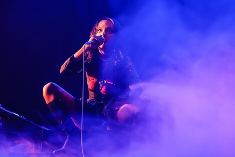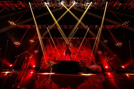 静寂から一転、続いて披露された「火炎」で再び会場の熱気が高まっていき、「ヴィーナス」のイントロではアヴちゃんの「覚えてる?」という問いかけに観客が熱い歌声で応える。「P R I D E」のひばりくんのギターソロに乗せてアヴちゃんが堂々とステージを闊歩すると、待ってましたとばかりに歓声と拍手が送られた。より妖艶さを増したアレンジで届けられた「KING BITCH」のあと、アヴちゃんは「どうぞたっぷりと女王蜂をご堪能ください」と言い残してステージをあとにする。残るメンバーが演奏したのは「鏡」。それぞれのセンスが光るセッションに観客が魅了される中、アヴちゃんは真紅のロングドレスに衣装を改めて再登場した。
