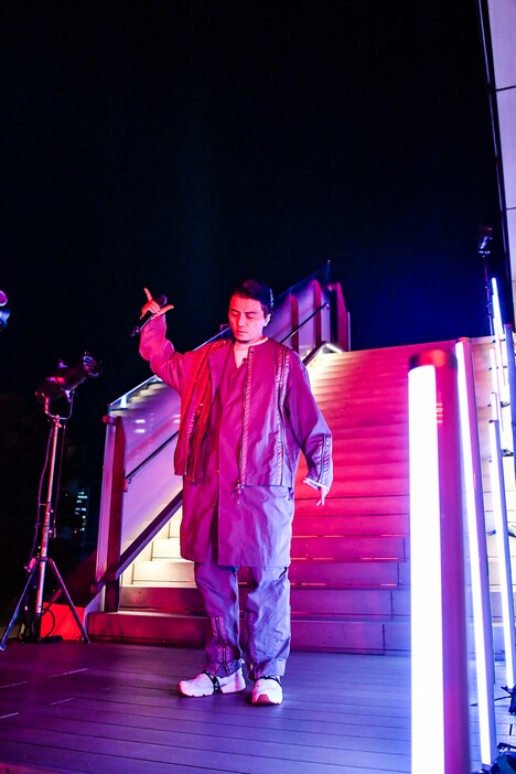 「俺とかみんなTechnicsのターンテーブルなしではいられない人間ばかりなので、この話が来たときは即“Connect”しました!」と「"Connect" Online Live」への出演依頼があったときのことを振り返ったKREVA。「時空を超えて、(ファンと)音でコネクトできているのがうれしいです。ひさしぶりのオンラインライブなので、ひさしぶりにやる曲も用意してきました」と自らに軽くプレッシャーを与えつつ、「ここ外だから……」と満月が映し出された壁の前へ歩を進めると、ラップスキルを存分に見せつける「Under the Moon」を披露した。曲の世界観に合わせて照明や演出だけでなく、シチュエーションも変えるという特別感のある構成となったこの日のライブ。KREBandが奏でる「基準 ~2019 ver.~」の重厚なアンサンブルに乗せて、KREVAは挑発するように指をカメラに向けると、王者の貫禄を漂わせながら屋上へ。そして「キター!」「ラブ」といったコメントが次々とチャット欄に流れる中、大都会の真ん中でエネルギッシュにラップを繰り出した。