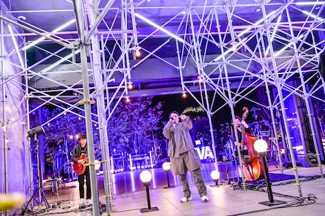 「ニューヨークっていう渋谷から生中継してます(笑)。いろんなシチュエーションから歌ってみようかと思います。こんなのもたまにはいいんじゃないでしょうか?」。そんな言葉からKREVAは室内に移動。柔らかく艶のある紫の照明で彩られた空間で、大神田の弾くウッドベースと、田中の奏でる穏やかなギターが織りなすグルーヴに身を委ねながら、「瞬間speechless」をゆったりと歌い上げる。恋に落ちた瞬間をロマンチックに表現したナンバーに視聴者はうっとり。しかしその余韻に浸る間もなく、今度は「Link」のトラックが響き、空気が引き締まっていく。KREVAは再び屋外へと足を運ぶと、視聴者に訴えかけるように「これは俺の歌 だけどこの瞬間に 君の歌 もう 俺らの歌 俺と君と君と君を繋ぐ」と「"Connect" Online Live」にぴったりなフレーズを真摯に紡いだ。さらにKREVAは、間髪をいれずにバンドの躍動感のある演奏とSONOMIの伸びやかなコーラスに乗せて「C'mon, Let's go ~2019 ver.~」を披露。曲間ではそのラップスキルをまざまざと見せつけるアカペラによるパフォーマンスを繰り広げ、視聴者を圧倒した。