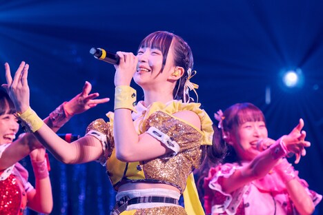 自己紹介とともに夢の日本武道館公演の意気込みを語ったメンバーは、節分をテーマにした楽曲「豆まきパラダイス」で元気よくパフォーマンスを再開。そのまま紅白のダウンライトに照らされたステージで「YESモチFEVER」を披露した。オーディエンスと一体となって“餅”をついた6人は、「SUN百6じゅ~GO!日ッチ☆」「サマーニッポン夏サマー」とアップテンポなナンバーをハイテンションに歌唱。「サマーニッポン夏サマー」のラストでステージを降り、場内中央に用意されたセンターステージへと歩いて移動すると、「止まらない!ト・マンナヨ!」をクールに歌い上げた。「サイエンス倶LOVE」「Furniture Girl」とセンターステージから艶やかな歌声を届けた彼女たちは、続いてミラーボールが回りステージの縁が虹色に光る華やかな演出のもと、「ちきゅらぶレイディオ」を歌唱。この曲で「このステージで夢と希望を」という歌パートを担当したことを機に、日本武道館のステージに立ちたいと思ったという楓は、思いがこもった歌声を響かせた。