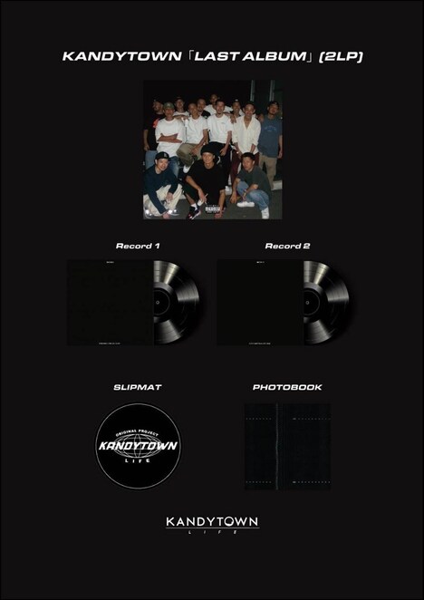 「LAST ALBUM」のアナログ盤はシリアルナンバー入りの三方背ボックス仕様で、スリップマット、LPサイズのフォトブックが付属。フォトブックの撮影は、KANDYTOWNの盟友である