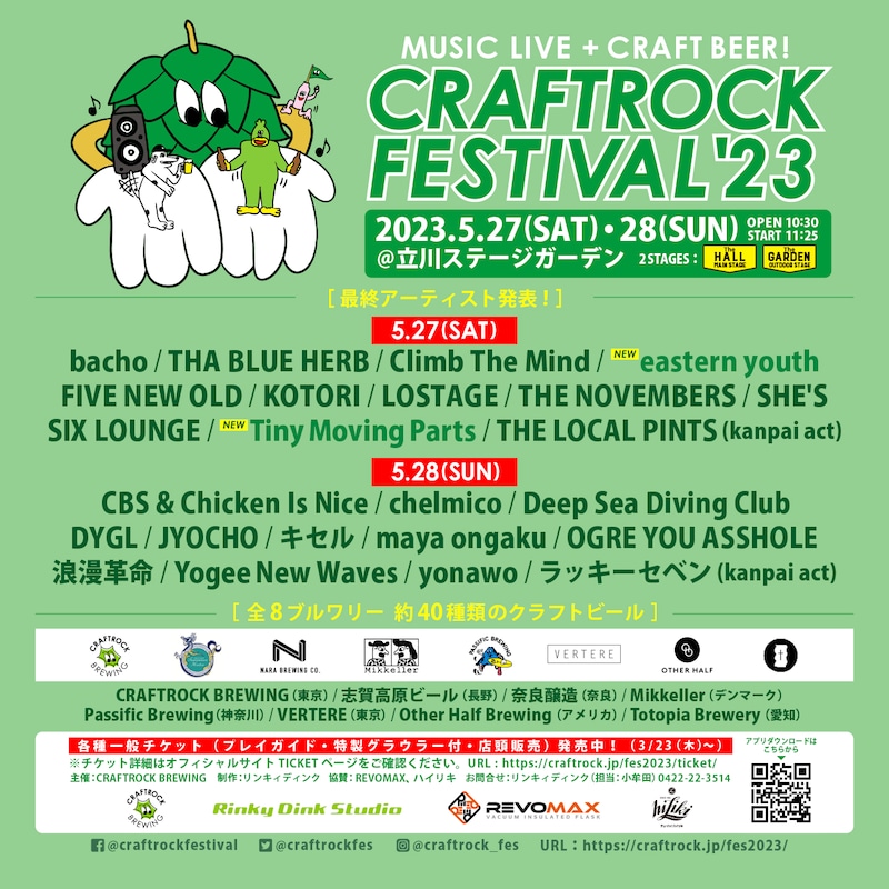 5月27、28日に東京・立川ステージガーデンにて開催される音楽フェス「CRAFTROCK FESTIVAL '23」の最終出演アーティストおよびタイムテーブルが発表された。