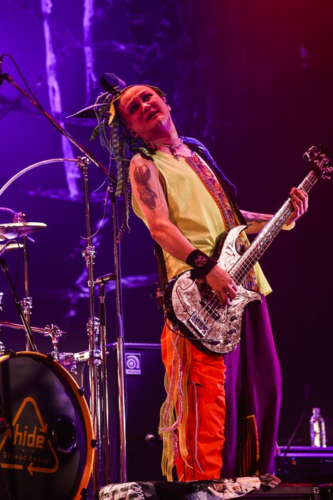 hideの功績を伝えるムービーの上映を経て、hide with Spread Beaverのアルバム「Ja,Zoo」のオープニングを飾るインストナンバー「Spread Beaver」が爆音で流れ、いよいよライブが始まった。映像とリンクしたメンバー紹介に大歓声が沸き起こる中、人気曲「ROCKET DIVE」へ。D.I.E.がショルダーキーボードを抱えて突撃体制でステージを駆け回り、ハイテンションなパフォーマンスを見せるなど、序盤からアクセル全開のステージが展開されていく。過去のhideツアーのライブ中に骨折したことがあるD.I.E.は、今回の復活ワンマンライブでは初日の大阪公演で足首を軽く捻挫するほどの暴れん坊っぷりだった。また重厚なリフの「POSE」ではKIYOSHIが、禍々しいルックスの改造ギター“ベルゼブブ”を低く構えて、ファンにおなじみの“両手離し奏法”を披露。ベルゼブブはhideモデルのギター・MG-Xに装飾を加えたKIYOSHIの特注モデルだ。ライブの途中から“お助け怪人”としてPATA(X JAPAN、Ra:IN)が登場。PATAは骨太なギターサウンドで「Celebration」のリフを奏で、Spread BeaverのメンバーがPATAの演奏に続いた。MCでI.N.A.は「また春が来ました。雲の上のhideとの二元中継。ひさしぶりにhideちゃんとの再会を楽しんでほしいと思います。今日という日をみんなが笑顔で過ごせることを願っております」とファンに呼びかけた。