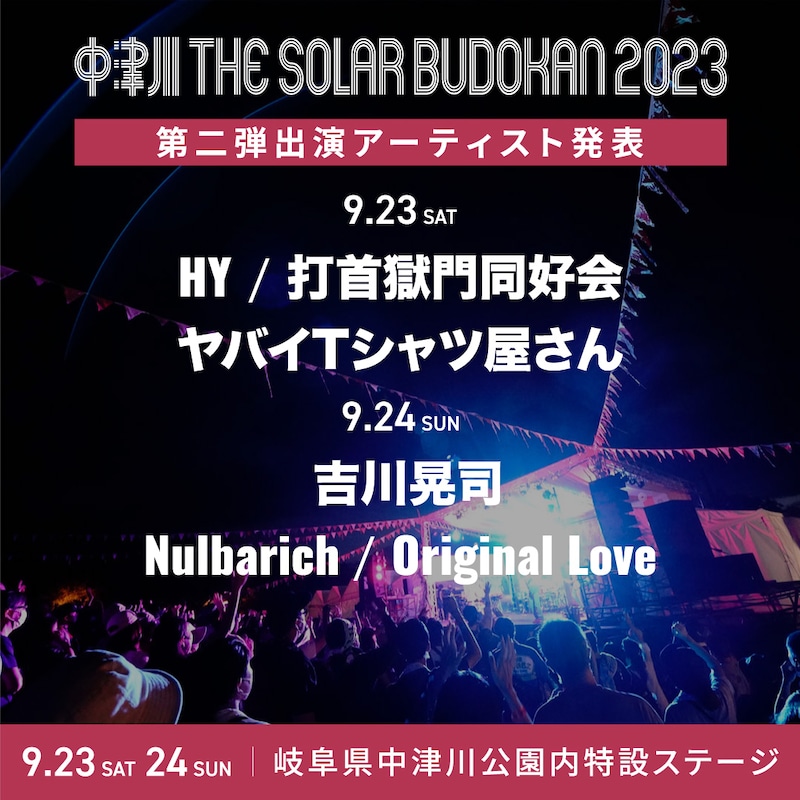 9月23日と24日に岐阜・中津川公園内特設ステージで開催されるロックフェス「中津川 THE SOLAR BUDOKAN 2023」の出演アーティスト第2弾が発表された。