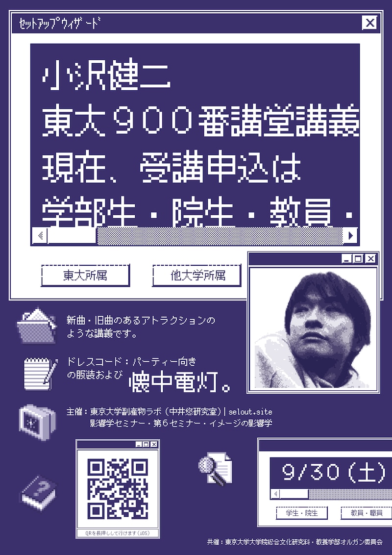 三島由紀夫の討論で有名な駒場キャンパスの900番教室(講堂)で行われる本講義。音楽演奏のある「アトラクションのような講義」を予定しており、小沢が今回のために特別に書いた新著「東大900番講堂講義・教科書」を独特な方法で使いながら進められる。この本は受講者が特別に購入できる書籍で、受講者には別途入手方法が連絡される。