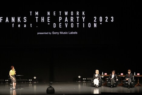 19時すぎに「TM NETWORK FANKS THE PARTY 2023 feat. "DEVOTION"」が開演すると、TM NETWORKファンとしても知られるフリーアナウンサーの住吉美紀が司会として登場し、「皆さんと同じFANKS(TM NETWORKファンの呼称)です」と自己紹介をして会場を沸かせた。「DEVOTION」はTM NETWORKとソニーミュージックが約25年ぶりにタッグを組んだ作品。そこで開会宣言として、まずは株式会社ソニーミュージックレーベルズ レガシープラス代表・中武宣廣氏がプレゼンテーションを行なった。この模様はソニーミュージックのライブ配信プラットホーム・Stagecrowdを通じて日本のみならず世界19カ国でも配信されており、中武氏は画面の向こう側の視聴者へ向けて流暢な英語も交えて挨拶をした。