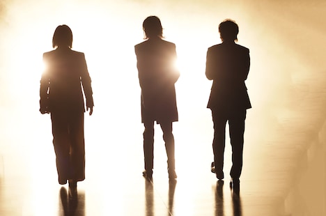 続けてステージ上の巨大モニターがリフトアップし、爆音で流れる「DEVOTION」とともに、TM NETWORKの3人がまばゆい逆光の中から登場。そして新作「DEVOTION」の先行試聴が行われ、ソファに座った3人が作品にまつわる貴重なトークを繰り広げていく。ステージ上ではカメラロボットが自走してメンバーを撮影。このカメラロボットはソニーの技術で研究・実装された自動撮影システムで、これによってTMらしい近未来的な生配信となった。