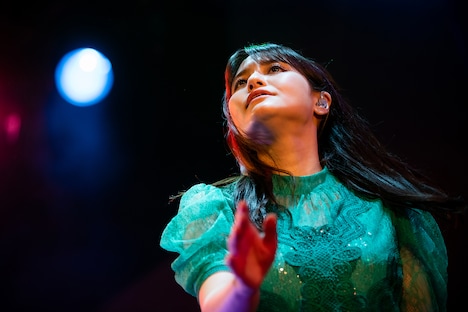 開演前から言い知れぬ熱気に満ち満ちていた客席の照明が落とされると、場内にスペーシーなテクノサウンドのオープニングSEが響き渡り、ステージにはまずバンドメンバーが入場。西脇辰弥(Key)、菰口雄矢(G)、池尻晴乃介(B)、渡嘉敷祐一(Dr)がそれぞれ持ち場につき、続いてグリーンのワンピースをまとった中島が悠然と姿を現す。すると、マスク着用の条件付きで観覧中の声出しが認められていたこともあり、客席の至るところから歓声が沸き起こった。そしておもむろにドラムのフィルインが打ち鳴らされ、エレキギターのオクターブカッティングがそれに追従する。これを皮切りにバンドが軽快な16ビートのアンサンブルを奏で始めると、中島の「みんな起きてー! 起きてるー?」の掛け声からファンキーなダンスナンバー「Wake Up!」の演奏がスタートした。