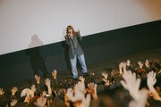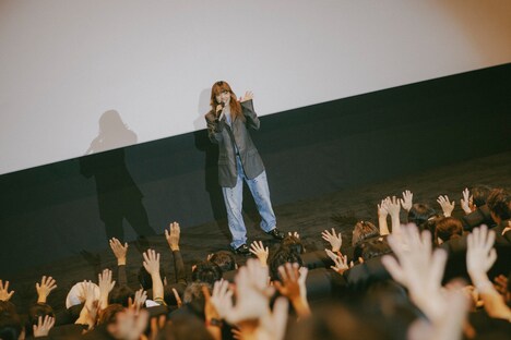 館内の照明が落ち、あいみょんがスクリーンに大きく映し出される。「サーチライト」のライブ映像について彼女は「何度観てもちょっと恥ずかしいなと思うけど、あのときの会場の雰囲気を思い出して、自分でもグッとくるシーンがありました」とコメント。続けて「間もなく上映スタートとなります。皆さん、ゆっくり楽しんでください……と、思いきや! 今からそちらに、向かいまーす!」と告げ、ざわつく観客の前に登場した。