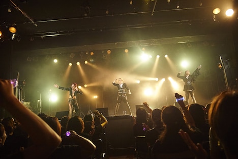 Takassyの「みんな、今日は本気出していこう!」という掛け声をきっかけに3人がファンとともにキャッチーなダンスを繰り広げた「BL」や、90年代ヒット曲のタイトルをつなぎ合わせた「90's」、メジャーデビュー曲「Moratorium」などポップな楽曲を次々と披露。また、痛烈な本音をリリックに乗せたラップ曲「PAY ME」や、妖しい世界観の「Toxygen」「CABARET」などを畳みかけ、観客をドラマティックでダークな世界へと誘った。本編ラストにはコロナ禍で思うようにライブができなかった時期に、Takassyが「いつかちゃんとライブができますように」と祈りを込めて制作した「Symphony」を熱唱。「聴かせてその声を」という歌詞に呼応するように客席から大合唱が巻き起こった。