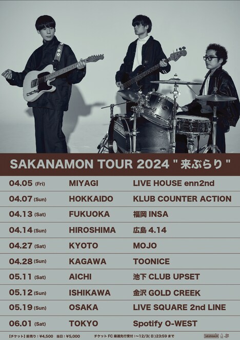 またSAKANAMONは2024年4月より全国ツアー「SAKANAMON TOUR 2024 “来ぶらり”」を開催。このツアーで彼らは4月5日の仙台公演を皮切りに、6月1日の東京公演まで全国10都市を回る。SAKANAMONのオフィシャルファンクラブ・帰ってきた ザ・サカなもんズでは12月3日までチケットの先行予約を受付中。