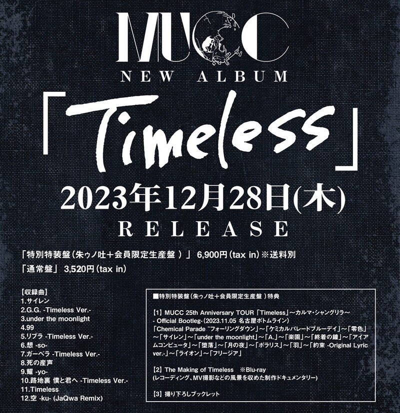 本作にはMUCCのアルバム再現ツアー「MUCC 25th Anniversary TOUR 『Timeless』」の会場限定シングルより6曲、同ツアーで再現されたアルバムの中から選ばれた4曲の再録バージョン、deadmanとのスプリットシングル「産声」に収録された「死の産声」、最新曲「Timeless」といった12曲を収録。会場限定シングルのうち1曲はリミックスバージョンとなる。なおMUCCの公式ファンクラブアプリ「朱ゥノ吐+」では、11月12日12:00に「特別特装盤(朱ゥノ吐+会員限定生産盤)」の予約受付がスタートする。
