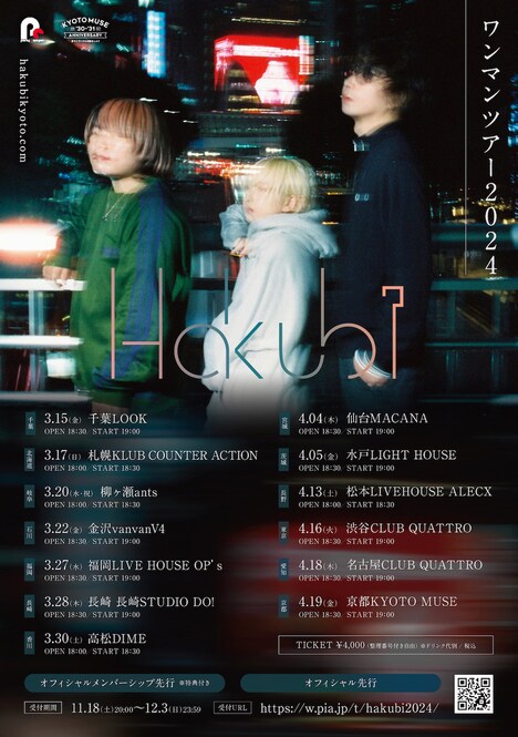 Hakubiはこのツアーで3月15日の千葉・千葉LOOKを皮切りに、4月19日の京都・KYOTO MUSEまで全国13カ所を巡る。バンドのメンバーシップサイト・ゆるはくびの里とチケットぴあでは、12月3日23:59までチケットの先行予約を受付中。ゆるはくびの里でチケットを予約をすると、公演当日に会場で特典グッズがプレゼントされる。