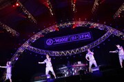 次に登場したのは、J-WAVE LIVE初出場の2PM。メンバーの登場を告げるオープニング映像が流れると、場内にはカウントダウンの声がこだまする。そして真っ白いスーツに身を包んだ6人が現れた瞬間、ワンマンライブさながらの大歓声が響き渡った。1曲目「I'm your man」では、男らしさを最大限にアピールした“ネクタイダンス”に1万1000人の観客も大興奮。メンバーたちは「音楽で皆さんの心と心をつなげるJ-WAVE LIVEの最後の日に出演できてとてもうれしいです」と客席に呼びかけた。さらに、ステージの途中では「I'm your man」のPV映像を挟んだり、衣装を替えたりと、最後まで観客を飽きさせないエンタテインメント性に富んだステージを展開した。