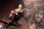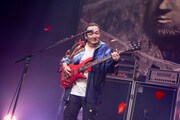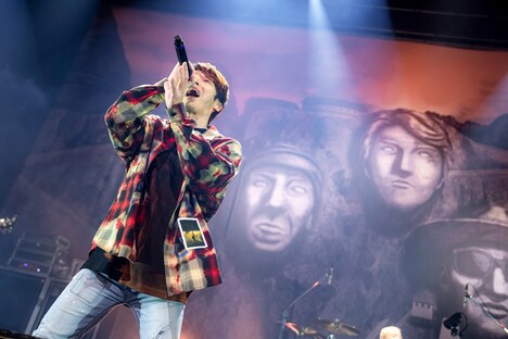 火影岩を背景にしたステージにTAKE(G)、GOT’S(B)、IWASAKI(Dr)が登場。3人は荘厳な雰囲気が漂う「NARUTO」のテーマソングを紡ぎ、オーディエンスを作品の世界観へと誘った。そしてKOHSHI(Vo)とKEIGO(Vo)が姿を現し、ASIAN KUNG-FU GENERATION「遥か彼方」のカバーでライブの幕を切る。イントロの力強いベースに始まり、疾走するツービートに乗せてKOHSHIとKEIGOは熱唱し、TAKEもエモーショナルなギターソロを繰り広げた。ORANGE RANGEの楽曲「ビバ★ロック」では軽やかなリズムに合わせてオーディエンスが一斉に腕を上げ、ピースフルなムードが場内に広がっていく。「『NARITO』を愛してますかー? 皆さん、今日はでっかい『NARUTO』愛のぶつけ合いですよ!」とKEIGOが叫ぶと、フロアは大きな歓声に包まれた。