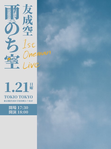 また友成空は1月21日に東京・TOKIO TOKYOで自身初となるワンマンライブ「雨のち空」を開催。チケットは各プレイガイドで販売されている。