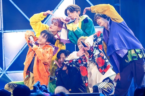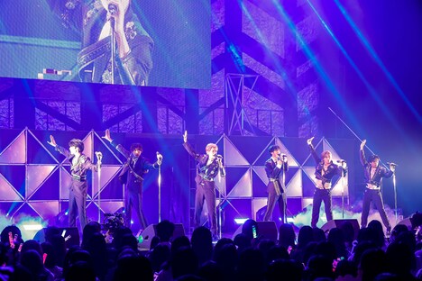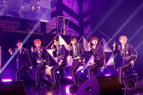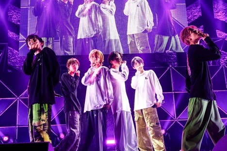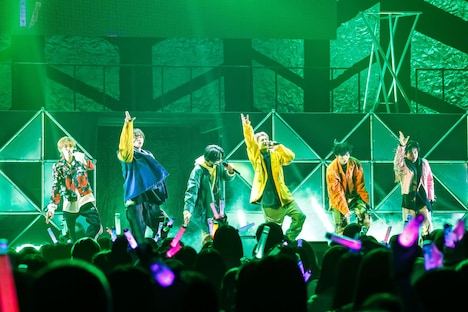 2曲目に投下されたユーロビート調のアッパーチューン「Neo Romantic」では、6人が次々とカメラ目線で決める「未体験……」の決めゼリフにフロアが熱狂。森田はトドメとばかりに唇を指でなぞって「Touch me, please」と言い放ち、Lienの歓声をほしいままにする。その森田の「俺たちメンバーの名前を呼んでください!」という呼びかけからスタートした「純情シンドローム」ではメンバーの名前を順に叫ぶLienの息ぴったりのコールが響きわたり、腰でリズムを刻みながら音に乗る6人のテンションを加速させていた。豪快に上着を脱ぎ去るジャケットプレイで曲を終えると、ここでLienに自己紹介をした6人。森田が「髪色似合ってますか? 今日は一生忘れられない思い出にしましょう!」と挨拶すると、続く武田も「髪色変えました!」とおどけてメンバーから「変えてない!(笑)」とツッコミを受ける。最年少・14歳の高桑真之は「このあとも健康第一で盛り上がっていきましょう!」とまっすぐに伝え、フロアから「かわいい!」の声を集めていた。