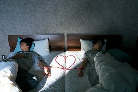 新たに公開された場面写真は、重岡演じる主人公・久我と、間宮が演じる劇団水滸のスター・本多雄一による“ベッドシーン”。2日目の朝の山荘で殺人事件が起きたという“設定”で劇団員の1人が姿を消す。しかし設定とは言い難い痕跡が残されており、久我たちは「本当に殺人事件が起きているのでは……?」と疑問を持ち始める。2日目の夜、久我はお互いのアリバイを作るために本多と同じ部屋で寝ることを提案。さらにお互いの手を赤い紐で縛ることでアリバイを確実なものにしようとする。本多は「こういうプレイは女の子としたかったぜ……」とぼやくが、事件解決に注力する久我は「プレイって言わないでください!」とツッコミ。こうして2人はともに夜を過ごすことになる。無事に3日目の朝を迎えた2人だったが、両者の間には赤い紐で描かれたハートマークが。緊張感のある時間を過ごす中、くすりと笑えるようなベッドシーンとなっている。次々に明かされていく怒涛の展開や驚愕のラストが気になる人は劇場で確認しよう。