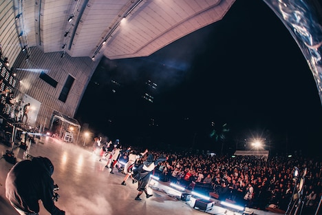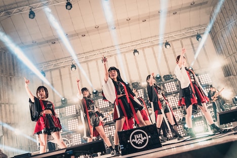 MCに移ると、6人はデビュー4周年を迎えた喜び、日比谷野音のステージに立てた感慨を口に。その感情を会場全体で共有したのち、オーディエンスをパワフルに煽って次のブロックへとなだれ込んだ。「Planetes」などのライブの鉄板曲だけでなく、セットリストに入ることが少ないレア曲ながらバンドアレンジが映えるナンバーも交えながら、右肩上がりにパフォーマンスのギアを上げていくINUWASI。結成当時に制作されたナンバー「透明になる」ではメンバーがるむのデスボイスが炸裂し、「Mother Earth」はアコースティックギターの音色を取り入れた特別なアレンジで届けられた。