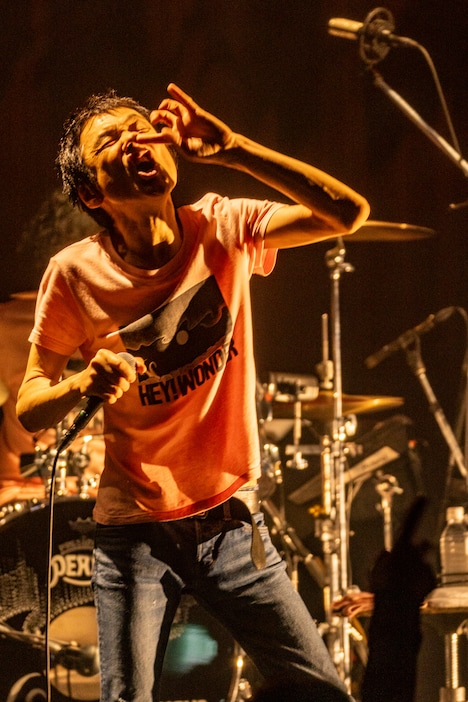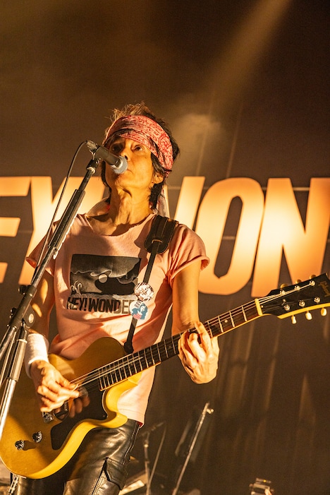桐田が怒涛の勢いで2ビートリズムを連打する最新シングル曲「あいのロックンロール」をはじめ、ニューアルバム「HEY! WONDER」の収録曲が次々に披露される今回のツアー。「大山椒魚」「ゆでたまご」といったユニークなタイトルから曲調を予想するのは難しいが、どれも「そう来たか!」とファンを唸らせる仕上がりで、甲本と真島のキャラクターが堪能できるキャッチーでエネルギッシュなキラーチューンがそろっている。