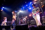 続くチリヌルヲワカはユウ(G, Vo)、イワイエイキチ(B)、中畑大樹(Support Dr / Syrup16g)の布陣でステージに上がり、序盤に「マシーン」「化ケノ皮」とアグレッシブな楽曲を連投。淡々とした様子でエッジの効いたカッティングを奏でるユウをはじめ、ストイックなパフォーマンスが続く。「甲と乙」でのオートワウの効いたベースソロから爆音ギターソロの流れでは、フロアからどっと歓声が湧き上がった。そして「今日は私たちのライブ初めとなっています。こんな素敵なイベントに出させていただいて、本当に光栄です。最後までよろしくお願いします」というユウの挨拶のあと、バンドはグルーヴィなベースラインで始まる「極楽浄土」を披露した。