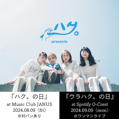 また今年は9月9日に東京・Spotify O-Crestで自主企画「ウラハク。の日」が開催されることも決定。地元・大阪とは異なる緊張感の中で、そのときのハク。をしっかり表現したいという思いから、ワンマンライブとして行われる。