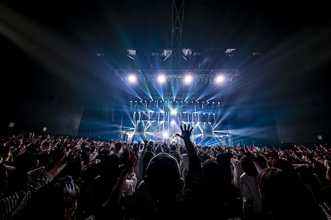 開演時刻を迎えてMy Chemical Romance「Welcome To The Black Parade」が流れると、Beemerが徐々に立ち上がって拍手を始める。その音量がどんどん大きくなっていくのを合図に場内が暗転。舞台を覆っていたカーテンがゆっくりと開き、ブルーのライトが場内のそこかしこを照らす。サポートのkowta2(コータツ)がDJプレイを展開する中でU、REI、MASATOがさっそうと姿を現した。ライブの幕開けを飾ったのは「マリッジソング」。パワーみなぎる歌声で、楽曲のテーマでもある究極の愛が描かれる。それから、リーダーのUを筆頭にBeemerを焚き付けるように何度も煽るTHE BEAT GARDEN。Uの「声出していこうぜ!」を合図にメジャーデビュー曲「Never End」がドロップされると、気迫に満ちたパフォーマンスに呼応するかのように、観客はジャンプしながらコールを繰り出した。