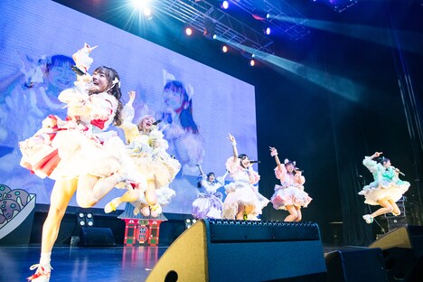 続いてステージに上がったのは、由良ゆら、貝賀琴莉、月なぎさ、琴るり、楠偉音によるグループ・#よーよーよー。5人は貝賀のブーケトスから始まるラブソング「BIG LOVE」、疾走感あふれる「トリップトリップ」、青春ソング「青い春」を3曲連続で歌う。そして「みんな私たちにメロメロになる準備はできてますか?」という煽りから新曲「すいーと♡でびる」をパフォーマンス。大きな歓声が上がるフロアをさらに盛り上げるべく「ピーポーピーポー僕ピーポー」「超☆My Way!!」とハイテンションな楽曲を畳みかけ、汗だくでライブを終えた。