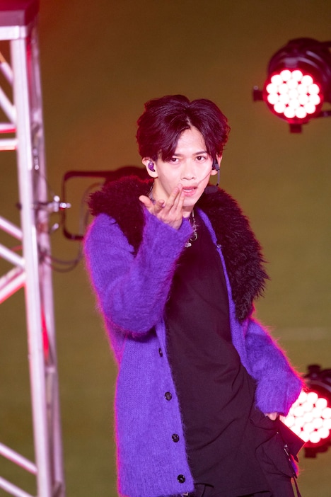 藤倉氏が降壇するなり、カイは「人類で初めてユニバーサルの社長と電車ごっこしたことを誇りに、これからも生きていきます」と笑いながらコメントした。ステージ場にエンディングのムードがほのかに漂う中、ハルは「え、終わりなの? やろうよ! まだみんな元気出せるよね!」とスタンドを煽る。8号車から返ってきた声に「どうですか先輩、この熱狂具合。やるかやらないかの2択だ!」と迫るハルに「当たり前だろ(笑)」と応えつつ、リョウガは「じゃあ、『Steal a Kiss』やったし、“キスつながり”であの曲やる?」とメンバーに告げた。