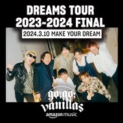 2023年にインディーズデビュー10周年、今年2024年にメジャーデビュー10周年を迎え、この2つのアニバーサリーイヤーを祝うライブを3月9日と10日に千葉・幕張メッセ国際展示場9~11ホールにて行ったgo!go!vanillas。「Amazon Music Live: DREAMS TOUR 2023-2024 FINAL」では、9日に行われたワンマン公演「MAKE MY DREAM」のノーカットライブ映像と、10日に行われた対バン企画「MAKE YOUR DREAM」のドキュメンタリー映像を流しながら、go!go!vanillasのメンバーがこの2日間を振り返る。ドキュメンタリー映像には、対バン企画に出演した