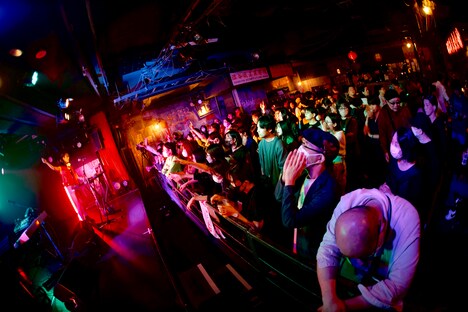 「クーロンズ・ゲート」はPlayStation用ゲームとしてソニーミュージックより1997年に発売されたアドベンチャーゲーム。1994年まで香港に存在した巨大建造物・九龍城砦がその舞台で、九龍城の陰界をテーマにした世界観、当時のCG技術をフルに駆使したJPEGダンジョン、グロテスクさがありつつも愛嬌のあるキャラクターなどが話題となり、今でもファンを魅了し続けている。「九龍夜總會」はゲームの発売27周年を記念して行われたもの。ゲーム内の香港で発生した陰界と陽界のバランスが崩れる陰陽交合事件から27年が経った2024年、渋谷の陰陽バランスが崩れて陰界の「龍城飯店」が出現したという設定で、来場者は本公演を通して“陰界”へと誘われた。開演前にはポップスから劇伴、空間演出音楽まで幅広く手がける作曲家の柳田しゆが、ゲームキャラクターの小黒(シャオヘイ)に扮した格好で登場。サウンドトラックやセリフをサンプリングしたDJプレイでフロアを温めた。