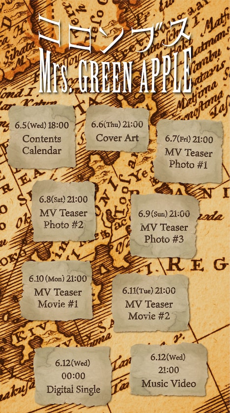 またMrs. GREEN APPLEは、本日6月5日から「コロンブス」リリース当日までの8日間、さまざまなコンテンツを展開していくスケジュールカレンダーを公開。明日6日以降は毎日21:00にジャケットアートワークやミュージックビデオのティザーなどが順次公開され、配信当日にはフルサイズのMVがYouTubeでプレミア公開される。