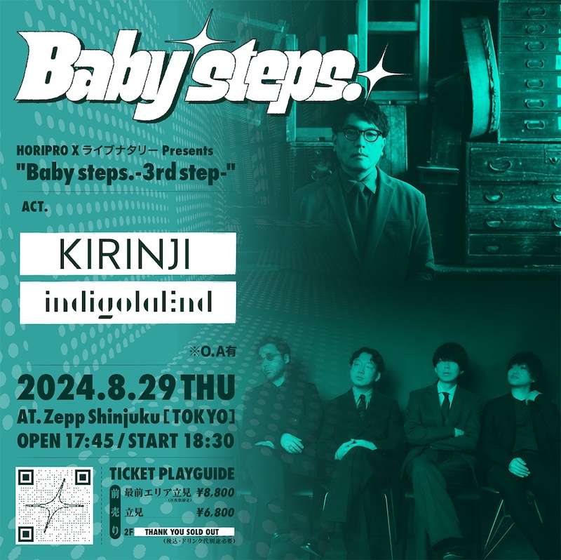 「Baby steps.」は「音楽ファンがさまざまなアーティストと出会うきっかけの場所となり、それぞれの人生のBaby steps.となりますように」という願いが込められたイベント。KIRINJIの堀込高樹は「indigo la Endの叙情的かつシックな音楽を間近で観られるなんてね! とても楽しみです」、indigo la Endの川谷絵音は「まさかKIRINJIとご一緒できるとは。僕らも全力で臨みます」とそれぞれコメントしている。当日は2組に加えて、オープニングアクトも出演予定。チケットぴあでは6月26日23:59までチケットの2次先行抽選予約を受け付けている。