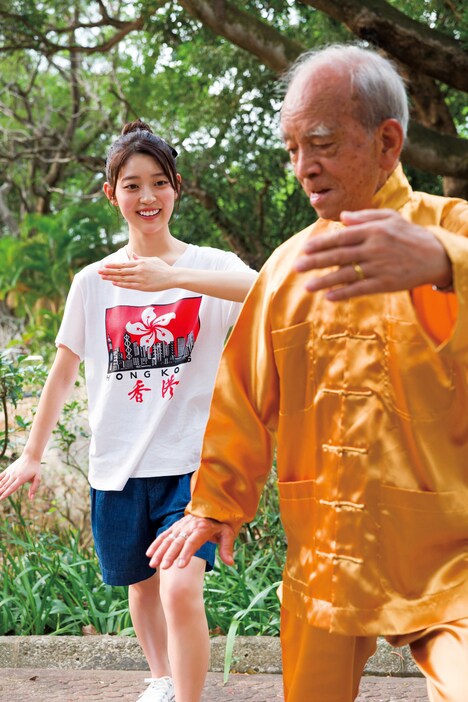 写真集の中でも特にお気に入りのカットとして阪口が挙げたのは、山頂でアイスを食べているカット。彼女は「撮影予定にはアイスを食べるカットはなかったんですが、山を登り切って、どうしてもアイスが食べたくなって。山を登ったあとのアイスは、最高においしかったです」と無邪気に笑った。また写真集には、霧がかかった山を舞台にした幻想的な雰囲気のカットが掲載されているが、当初は霧を想定しておらず、こちらもいい意味で想定外のカットになったという。さらに、印象に残っている撮影のエピソードを問われた阪口は「足ツボマッサージをしたんですけど、私はけっこう健康オタクなので、痛くないだろうと思っていて。平気だろうと思ったら、すっごく痛かったです」と苦笑い。太極拳を達人から学ぶカットの話題になると、「楽しかったです。達人がすごく褒めてくれるんですよ。言葉は通じないんですけど、『ナイスナイス!』って。気分がよかったです」と声を弾ませた。
