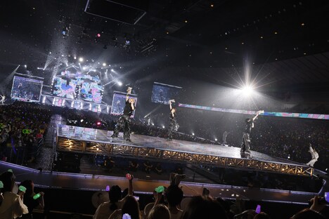 「puzzle」のラストで3人が見つめ合いながら歌って観客の視線を奪ったところで、ソロコーナーへ。佐藤が音源化されていない「Black & White」を王子のような衣装で歌唱し、手を首元に滑らせる振り付けで場内を沸かせる。菊池は素肌に真っ赤なジャケットを羽織ったセクシーな装いで「rouge」をパフォーマンスし、マイクを使用せずにアカペラで歌声を響かせるひと幕も。なお、この2曲は2017年に行われたイベント「Summer Paradise 2017」以来、約7年ぶりにライブで披露された。松島は2019年リリースのアルバム「PAGES」より「CRY」を歌唱。彼は、自身が活動休止中にメンバー4人がパフォーマンスをした映像を背に、切々とした表情で歌い上げた。