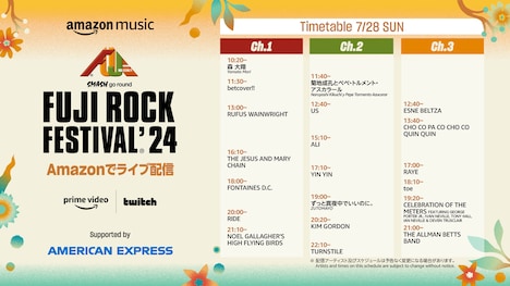 7月26日から28日にかけて新潟・苗場スキー場で行われる野外フェスティバル「FUJI ROCK FESTIVAL '24」の模様がPrime VideoとTwitchにて無料で世界同時生配信されることが決定。本日、配信アーティストのラインナップおよびタイムテーブルが公開された。