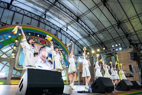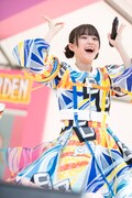 メインステージのHOT STAGEでトリを務めたえびちゅう。体調不良のため急遽欠席した桜木を除く9人は、自己紹介ラップナンバー「Knock You Out!」を勇ましく歌い上げてオーディエンスを鼓舞する。続いては「揚げろ!エビフライ」で観客と一体になってのタオル回しを繰り広げたかと思うと「ラブリースマイリーベイビー」でキュートな笑顔を振りまき、その多彩な魅力をアピールした。