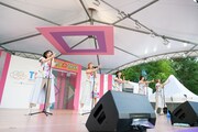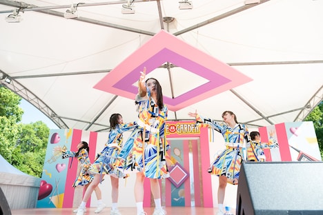 えびちゅうの「TIF」出演は3年ぶり8回目。先陣を切ったのは14:30からSMILE GARDENに登場した妹組だ。桜木心菜、小久保柚乃、風見和香、桜井えま、仲村悠菜の5人は全員の加入前、2019年に行われたえびちゅうの恒例野外ワンマンライブ「ファミえん」で姉組メンバーたちが着用していた衣装で登場し、えびちゅうファミリー(私立恵比寿中学ファンの呼称)を驚かせる。最初に披露したのは結成初期のレパートリー「ダイビング」。イントロでは桜木と風見が華麗な側転を決めてオープニングを飾った。