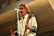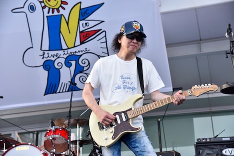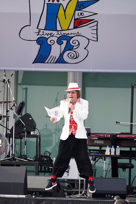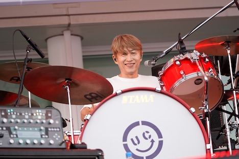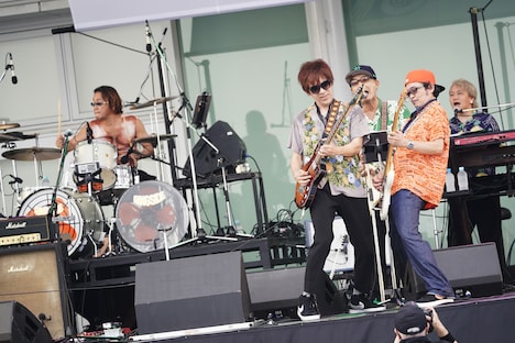 海風がステージに向かって吹き、開放感に拍車がかかるリビエラ逗子マリーナの一角。ドラムセットにスタンバイしたABEDONは「俺と同じ空気を吸ってくれー! そして吐いてくれー! そして脱いでくれー!」と叫ぶとアロハシャツを勢いよく脱ぎ、レスラーを想起させる筋肉プリントのタンクトップ姿に。黄色い歓声を受けてABEDONがスティックを振り下ろすと、八熊が「ハバナエキゾーチカ」を歌い出した。ユニコーン同様、ABEDON AND THE RINGSIDEも曲ごとにメインボーカルやパートが入れ替わる多彩なスタイル。この日はライブ中盤から、ABEDONのご近所さんという伊地知が加わりにぎにぎしさに拍車がかかっていた。ABEDON AND THE RINGSIDEのメンバーと同様にアロハシャツを着た伊地知は、「キヨシ」コールを浴びながら「ケダモノの嵐」「与える男」の2曲で卓越したドラムプレイを披露。イントロのギターリフが鳴った瞬間にプールサイドがざわついた「与える男」では、伊地知自身のリクエストでセットリストに組み込まれたという背景があるだけに、気合いの入ったパフォーマンスを繰り広げてユニコーンフォロワーとしての顔をのぞかせた。