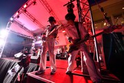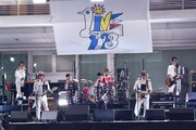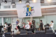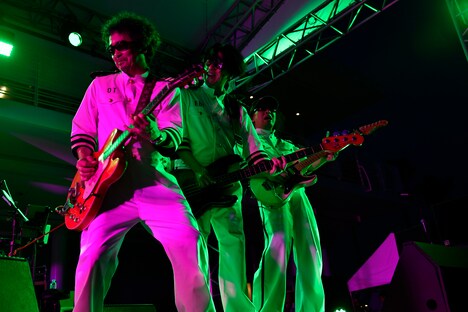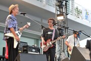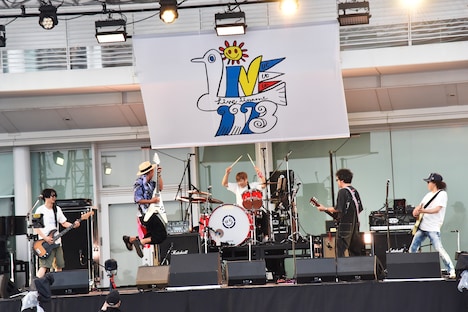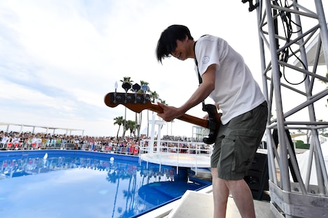 川西幸一、手島いさむ、EBIからなる電大は、そろいの白いTシャツをまとって登場。「ハロー、ズッシー」とカタコトの川西の挨拶を機に、「ようこそ」で3ピースバンドならではのソリッドなアンサンブルを轟かせる。3人が奏でる音は風に乗って会場中に広がっていき、開放的な空気がオーディエンスを包み込んでいく。矢沢永吉のライブばりのタオル投げがプールサイドで繰り広げられた「Body Guard」を経て、川西が「僕たちのお友達に参加してもらおうかな。手島さん、(ギターを)ジャーンとやってよ」とリクエスト。手島のかき鳴らすギターの豪快な音に乗って現れたのはゲストのつるの剛士だ。白いフライングVを構えてステージ中央に立った彼は、太く伸びやかな声で「A GOOD DAY」を歌い上げ、「いやあ、うれしいなあ。すごい景色。もう夢みたい!」と喜びを爆発させた。