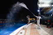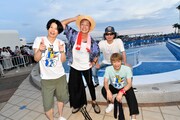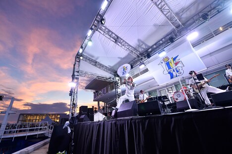 トリのユニコーンが現れたのは、ロマンチックなマジックアワーのタイミング。心地よい波音が聞こえる中、会場のシチュエーションにふさわしい衣装に身を包んだメンバーが姿を見せるとオーディエンスは大歓声を上げる。熱烈な歓迎を受けた5人は、ABEDONがリードボーカルを取る「SAMURAI 5」でライブをスタート。曲の途中でABEDONは「俺、逗子マリーナのプールサイドであいつを見つけたんだよ」と繰り返しつつ、虫取り網を持ってプールの近くへ。そして水上をプカプカと流れてきた鎌倉市の名産「鳩サブレ」をすくい上げ、それを奥田と食べ始めるなどマイペースなステージングを見せていく。