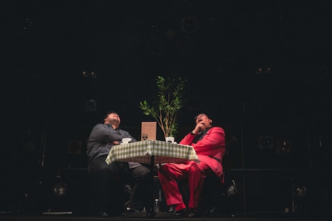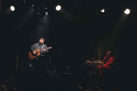 まずは澤部が、ステージ下手のマイクの前に立ち、「UNDER 25 OWARAI CHAMPIONSHIP」のテーマ曲「期待と予感」を弾き語り。軽快なメロディとしっとりした歌声が、観客の心を優しく躍らせる。曲が終わると、すかさず街裏がステージ上手へ。「R-1グランプリ2024」でも披露された、石川啄木を題材にした漫談で、会場を爆笑の渦に包み込んだ。その漫談の舞台設定がプールであることから、続く澤部は、同じくプールが舞台の映画「水深ゼロメートルから」の主題歌「波のない夏」を歌唱。数珠つなぎ的に連鎖していく2人のパフォーマンスに、観客の視線は冒頭から釘付けになっていく。……と、これはあくまで喫茶店にいる2人の妄想。あまりに鮮明な“シミュレーション”を終えた2人は「いい始まりじゃないですか?」「ね! ヤバそう! お客さんも喜んでくれるといいですねー」と口々に感想を述べ合う。澤部が「温かい拍手とか聞こえてきたりするかな……?」と疑問を口にすると、客席からは大きな拍手が沸き起こった。