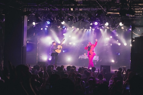 2人の思惑通りに鳴り続ける拍手を受けて、澤部と街裏はステージに登場。彼らはこの日初めて観客に語りかけ、街裏が「皆さんに早く語りかけたかったんですけどね。そういう機会のないライブやから」と笑った。澤部は「今年の年明けくらいに、あるイベントでPUNPEEさんが『ODDTAXI』をやったときに、偽スカートとして空気階段の鈴木もぐらさんが出るっていうのがあったんですよ。PUNPEEさんが僕のパートを歌って、鈴木もぐらさんが自作のラップを披露して大盛り上がりみたいな感じだったんです(笑)」と語り、「僕はラップは書けないんですけど、こちらに……」と街裏を示す。街裏は「名古屋と大阪、どっちもミスってるんですよね……」と緊張をにじませながら背水の陣でパフォーマンスへ。澤部が伸びのある歌声を響かせる横で、街裏が見事ノーミスでラップを繰り出し、ツーマンツアーは輝かしいエンディングを迎えた。