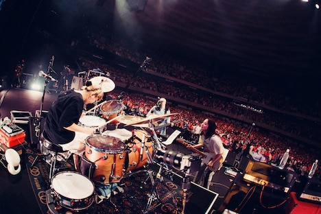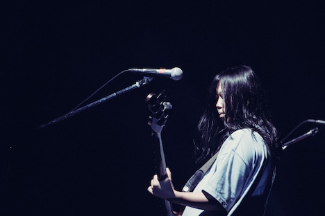 入場時には自動制御のリストバンド型ライト・PIXMOBが配布され、観客はそれを装着して開演を今か今かと待ち望む。そしてPIXMOBが一斉にオレンジ色に点灯し、期待感がまたたく間に会場に充満したところで、普段と変わらないラフな装いで上野羽有音(Vo, G)、いのり(B)、ミユキ(Dr)が登場。上野が「武道館でワンマン、TETORA始めます!」と宣言し、青春感が漂うロックナンバー「わざわざ」をパワフルに演奏する。観客のテンションを一気に引き上げたところで、「13ヶ月」より「7月」「8月」「9月」を連投して日本武道館に夏の空気を送り込んだ。