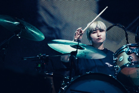 後半ではギアチェンジし、軽やかなビートのエールソング「頑張れた」、ハートフルなナンバー「憧れ」など再びアッパーな楽曲を繰り出すTETORA。上野は汗だくで髪を乱しながらも、そんなことはお構いなしといった様子でフルパワーでパフォーマンスし、ロックバンド然とした無骨な姿勢を見せつける。一方で切ない歌詞が印象的な「ネコナマズ」では、ブルーに輝くPIXMOBで彩られた客席を見つめて「すごい、涙みたい」と何かに思いを馳せるようにつぶやいた。その後、TETORAは3人のグルーヴが炸裂する「バカ」、攻撃的なラウドナンバー「6月」を畳みかけた。